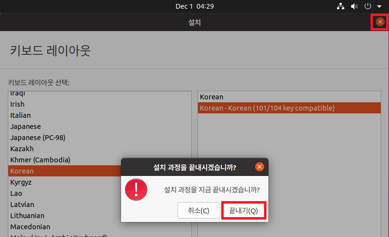 먼저 설치 화면의 우측 상단에 있는 X 버튼을 클릭해서 설치 과정을 종료한다.