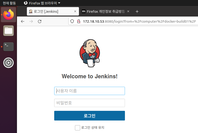 가상 머신의 브라우저를 실행해서 Jenkins에 접속한다.