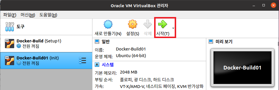 VirtualBox에서 빌드 에이전트로 등록할 가상 머신을 선택하고 시작 버튼을 클릭한다.