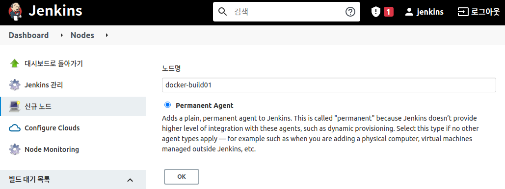 가상 머신 생성이 완료되면 Jenkins에 빌드 에이전트로 등록해야 한다.