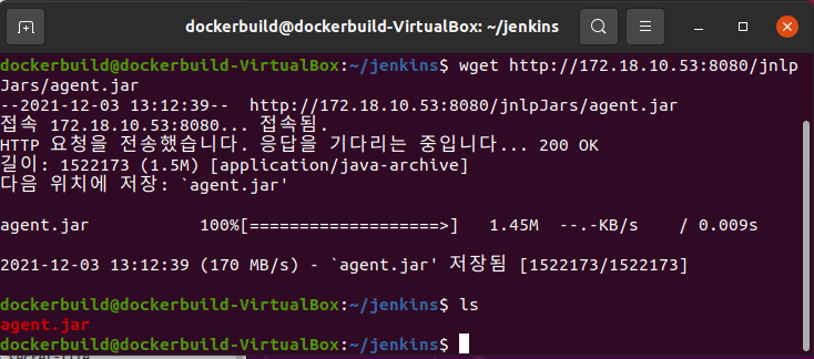 wget 명령어에 복사한 URL을 이용하여 agent.jar 파일을 다운로드한다.