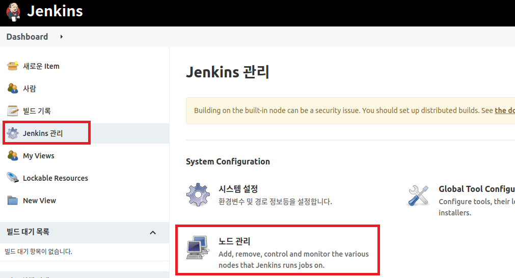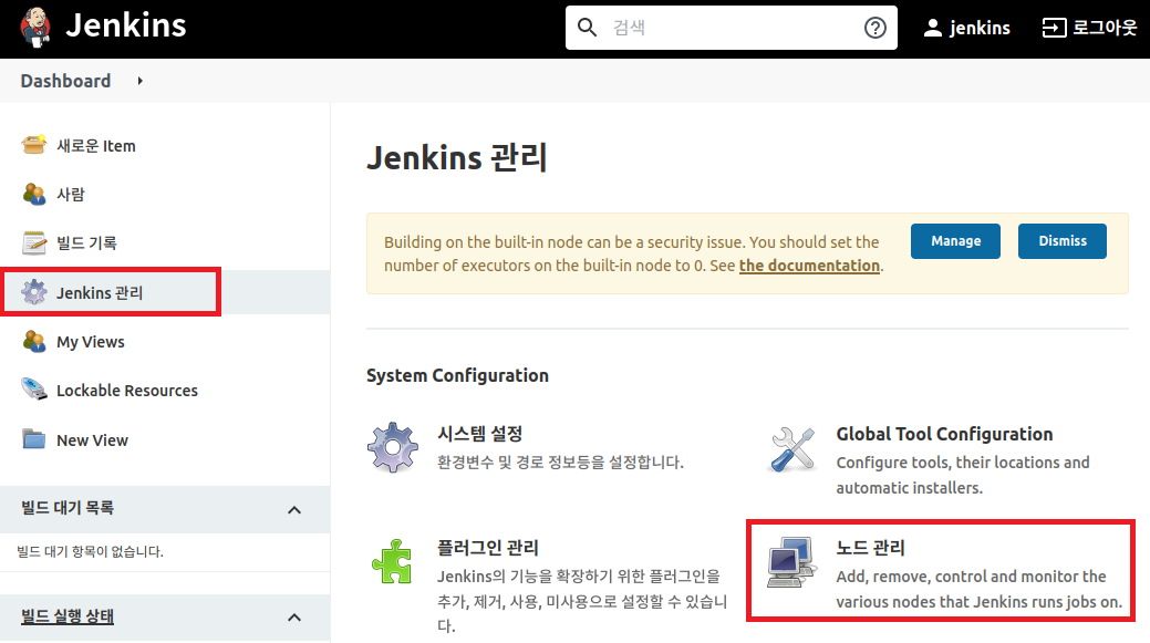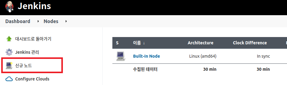Jenkins에 로그인 하고 좌측의 Jenkins 관리를 클릭한 다음, 우측의 노드 관리를 클릭하여 빌드 에이전트 목록 화면으로 이동한다.
