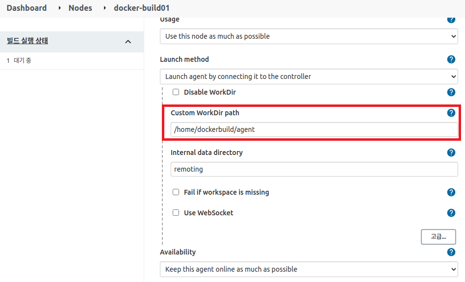 빌드 에이전트 내부에서 Jenkins가 작업을 수행할 경로를 지정한다. remote root directory 하위의 agent 경로를 지정했다.