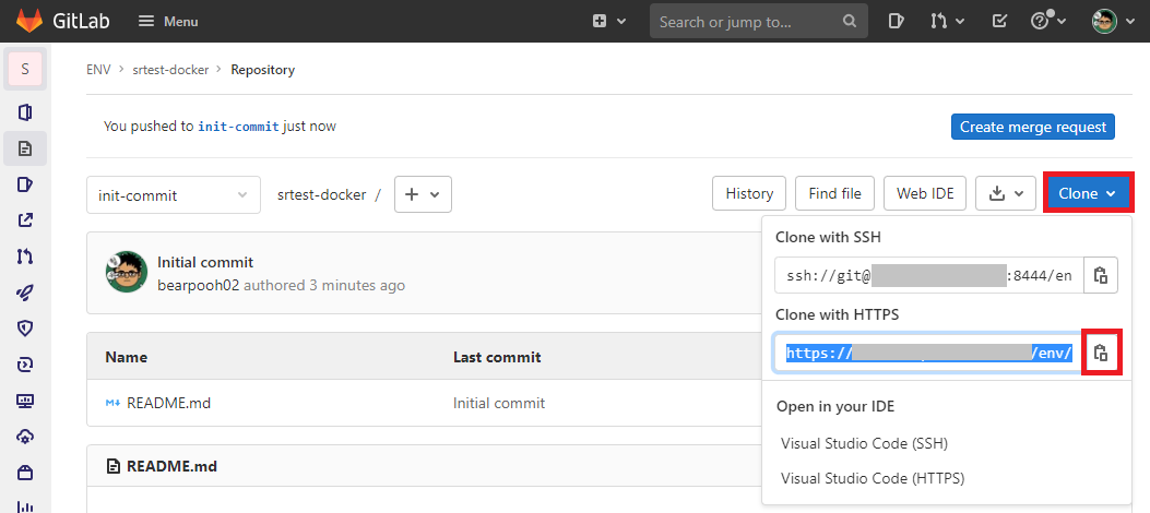 브랜치가 생성되면 우측 상단의 Clone을 클릭하고, Clone with HTTPS 우측의 복사 버튼을 클릭한다.