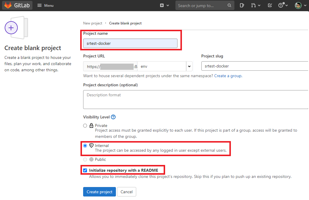 Project는 Internal, README 생성 옵션에 체크한다. (이 부분은 필요에 따라 결정한다.)