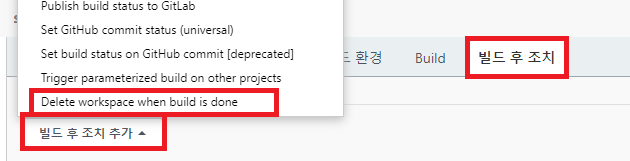 빌드 후 조치 추가를 선택하고 Delete workspace when build is done을 클릭한다.
