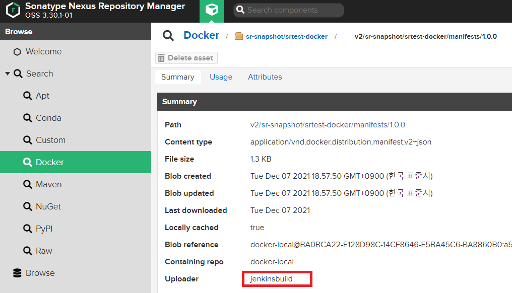 우측에 빌드 플랜에서 지정한 sr-snapshot 경로에 정상적으로 업로드 된 것을 확인할 수 있다.