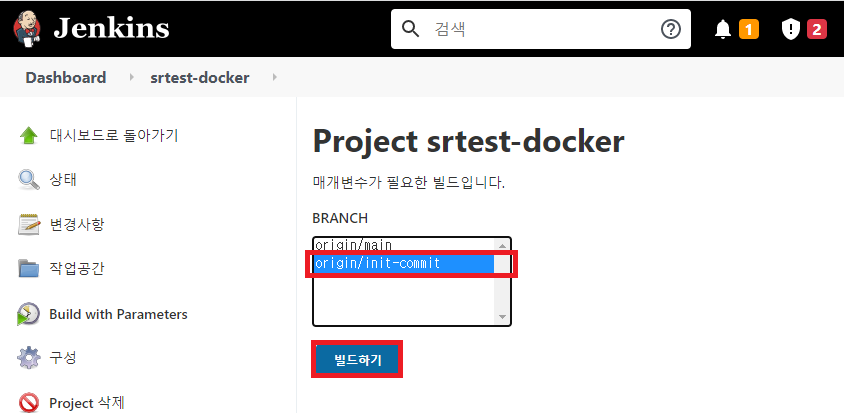 빌드 할 브랜치를 선택한다. 테스트 코드가 있는 init-commit 브랜치를 선택하고 빌드하기를 클릭한다.