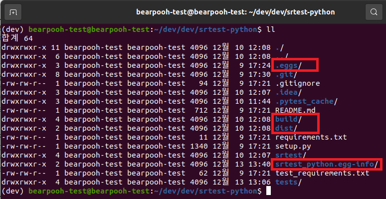 whl 패키지를 생성하면서 dist와 함께 build, srtest_python.egg-info 폴더가 생성된다.