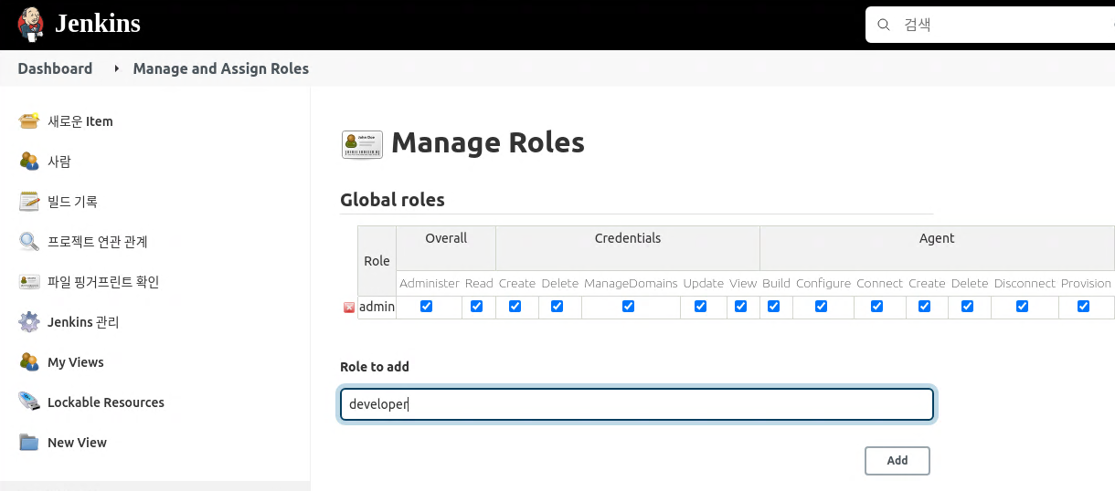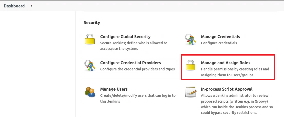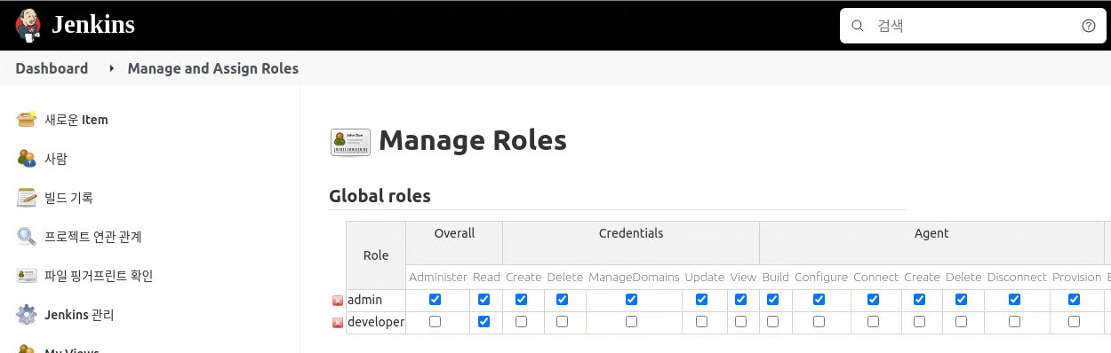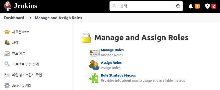 Jeknins 관리 메뉴를 다시 클릭하면 Security 항목에 Manage and Assign Roles 항목이 생성 된 것을 확인할 수 있다.
