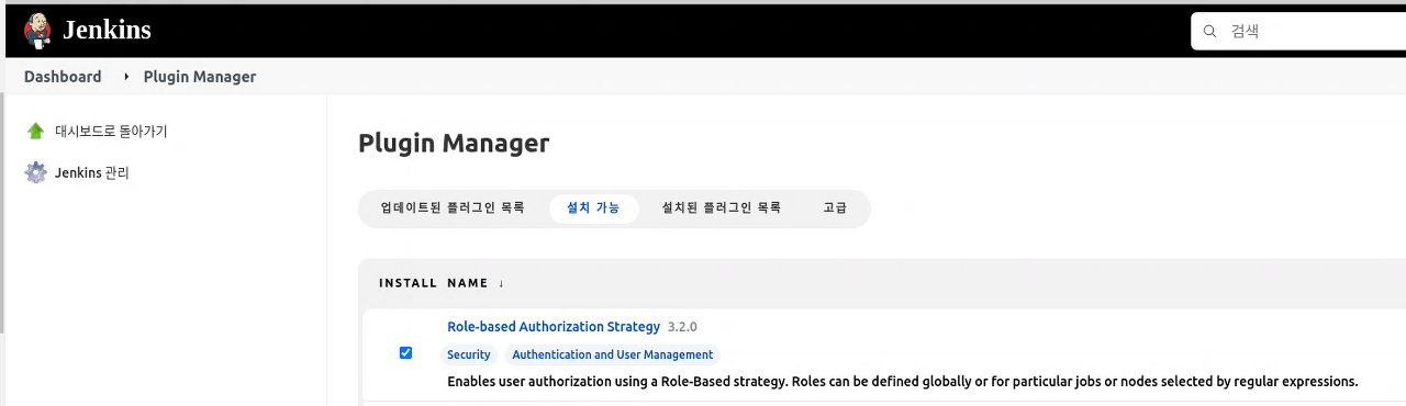 설치 가능 항목에서 Role-based Authorization Strategy 플러그인을 검색한다. Role- 까지만 입력하면 검색 된다.