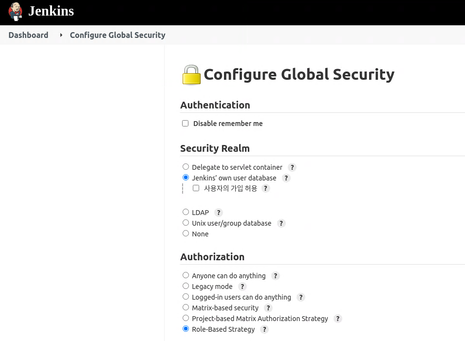 플러그인 설치가 완료되면 Jenkins 관리 - Configure Global Security 메뉴의 Authorization 항목에 Role-Based Strategy가 생성된 것을 확인할 수 있다.