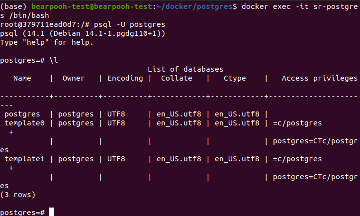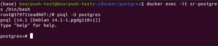 $ docker exec -it sr-postgres /bin/bash