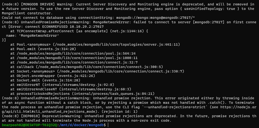 아래 명령으로 mongo-express 컨테이너의 로그를 확인해보면 오류가 발생한 것을 확인할 수 있다.