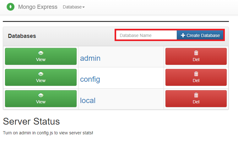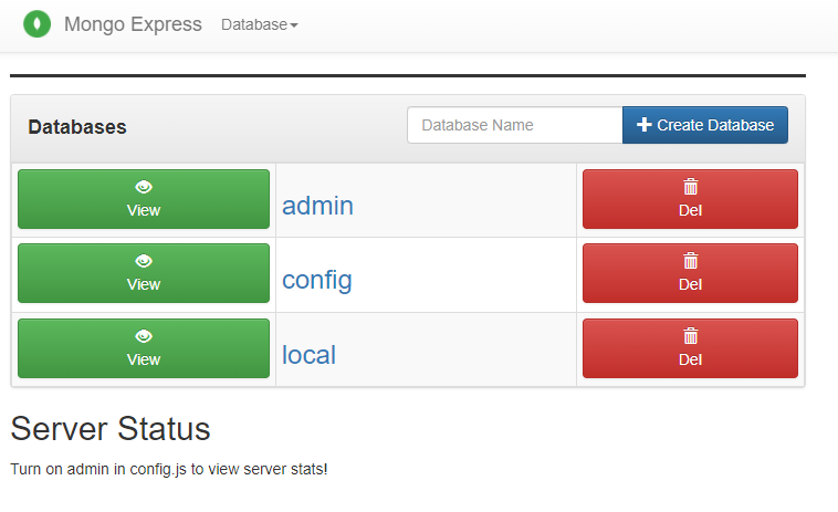 mongo-express 컨테이너가 정상적으로 실행되었는지 확인하기 위해 아래 URL로 접속한다.