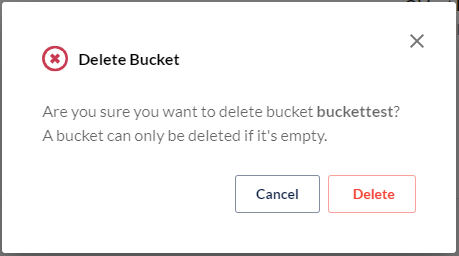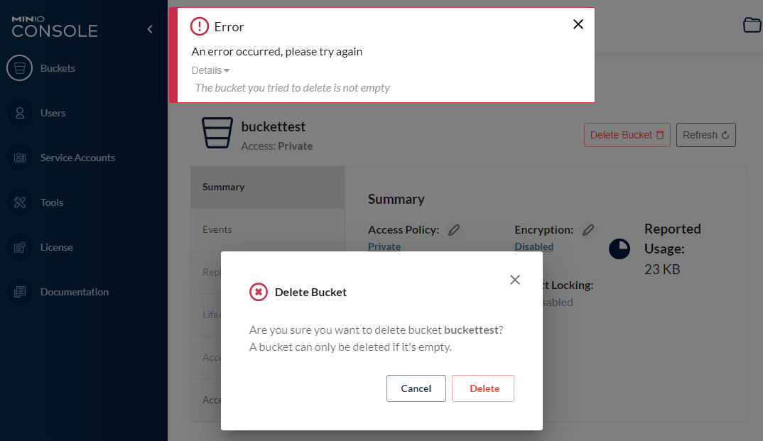 아래와 같이 비어있는 bucket만 삭제 가능하다는 메시지가 표시된다.