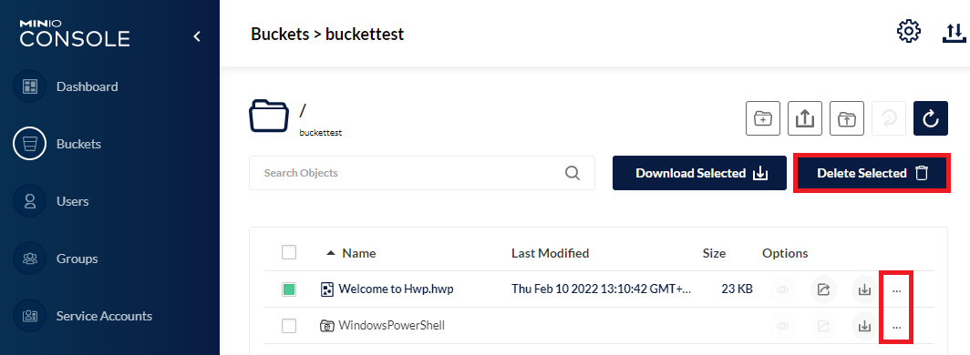 여러 개의 파일이나 폴더를 삭제하는 경우 좌측에 체크하고 상단의 Delete Selected 버튼을 클릭한다.