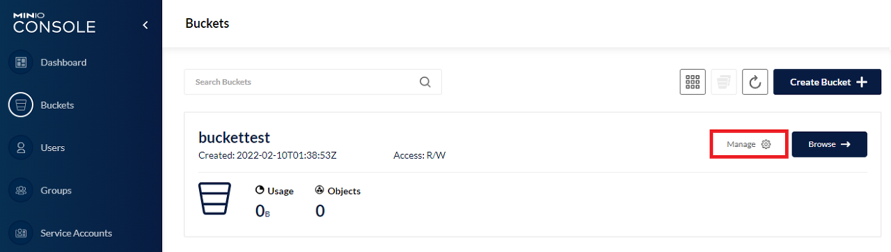 버킷 목록에서 해당 버킷의 Manage 버튼을 클릭한다.