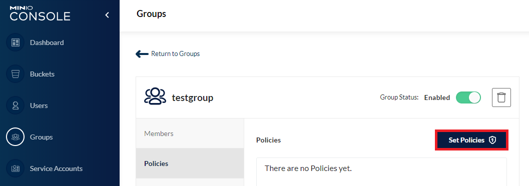 Policies를 선택하고 우측의 Set Policies 버튼을 클릭한다.