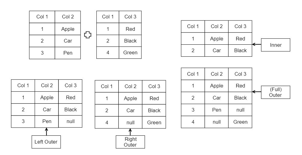 2개의 테이블에서 Key 컬럼의 레코드가 일치하거나 한쪽에만 존재하는 결과를 포함하여 반환한다.