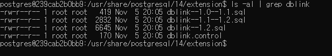 dblink를 사용하기 위해 해당 컨테이너 내부에 dblink 모듈이 존재하는지 확인한다.