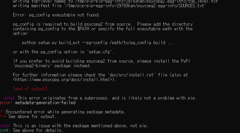 PostgreSQL이 없는 환경에서 설치하면 다음과 같은 오류가 출력된다.