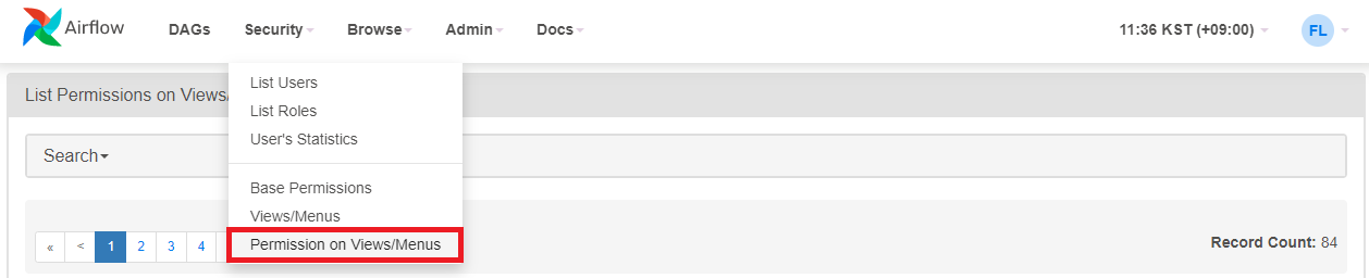 AirFlow에서는 아래와 같이 상단의 Security 메뉴에서 사용자 계정과 권한 관리 기능을 제공한다.