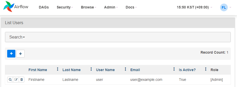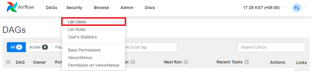 AirFlow의 계정 관리는 Security 메뉴의 List Users에서 제공한다.