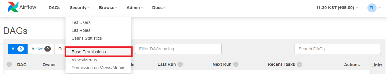 Base Permissions를 클릭하면 AirFlow에서 제공하는 기본 권한들을 확인할 수 있다.