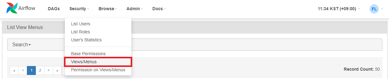 Views/Menus를 클릭하면 AirFlow에서 제공하는 메뉴들의 목록들을 확인할 수 있다.