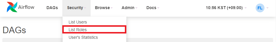 AirFlow의 역할 관리는 Security 메뉴의 List Roles에서 제공한다.