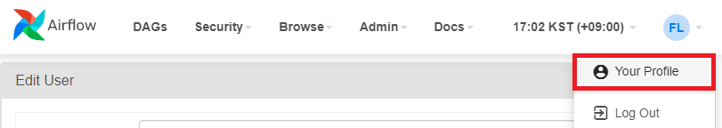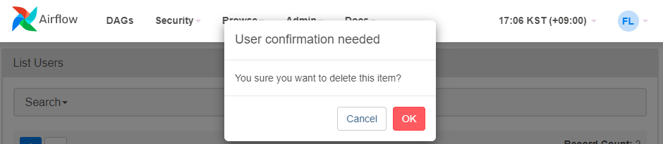 AirFlow의 계정 관리는 Security 메뉴의 List Users에서 제공한다.