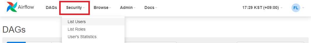 AirFlow에서는 아래와 같이 상단의 Security 메뉴에서 사용자 계정과 권한 관리 기능을 제공한다.