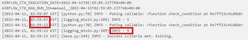 로그를 확인해보면 15초 뒤에 재실행했고, 9가 나오자 True를 반환하고 성공 한 것을 확인할 수 있다.