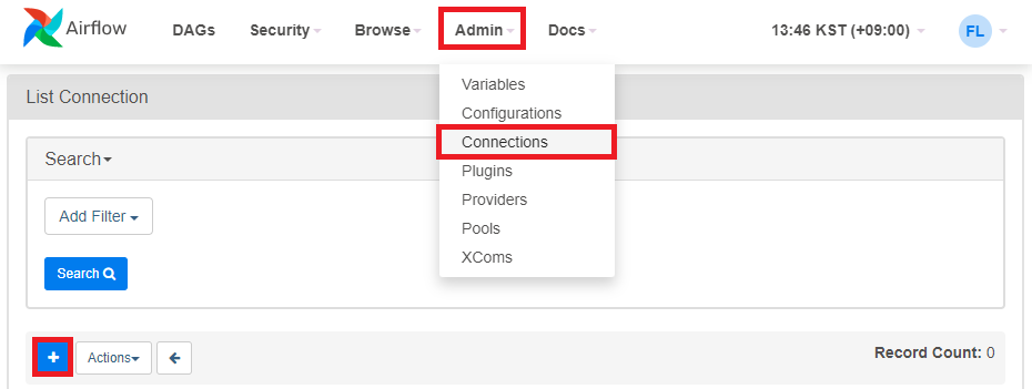 AirFlow 상단의 Admin 메뉴에 있는 Connections에서 + 버튼을 클릭한다.