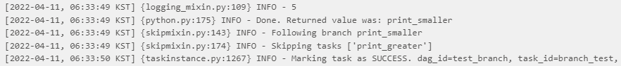 DAG를 확인해보면 print_smaller를 실행하고 print_greater를 생략한 것을 확인할 수 있다.