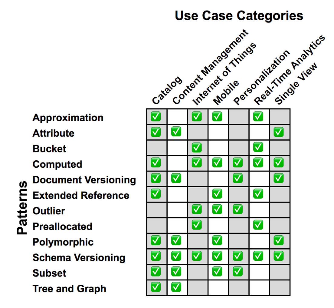 아래 그림은 mongodb 사이트에서 제공하는 디자인 패턴들의 활용 분야에 대해 정리한 것이다.