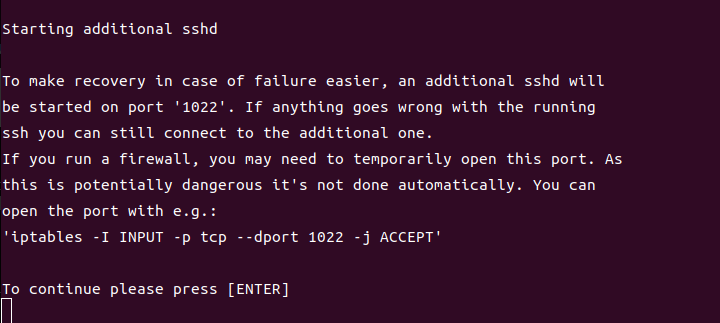 y를 입력하면 1022 포트 사용안내 및 터널링에 대한 설명을 제공한다. 엔터를 입력한다.