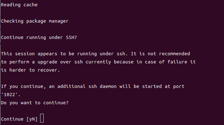 SSH로 연결하여 진행하는 경우 1022 포트 추가 개방 등에 대한 메시지는 출력되지만 정상적으로 업그레이드가 진행된다.