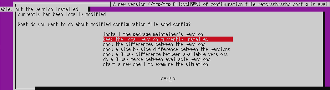 ssh server 관련 설정도 Keep the local version currently installed를 선택한다.