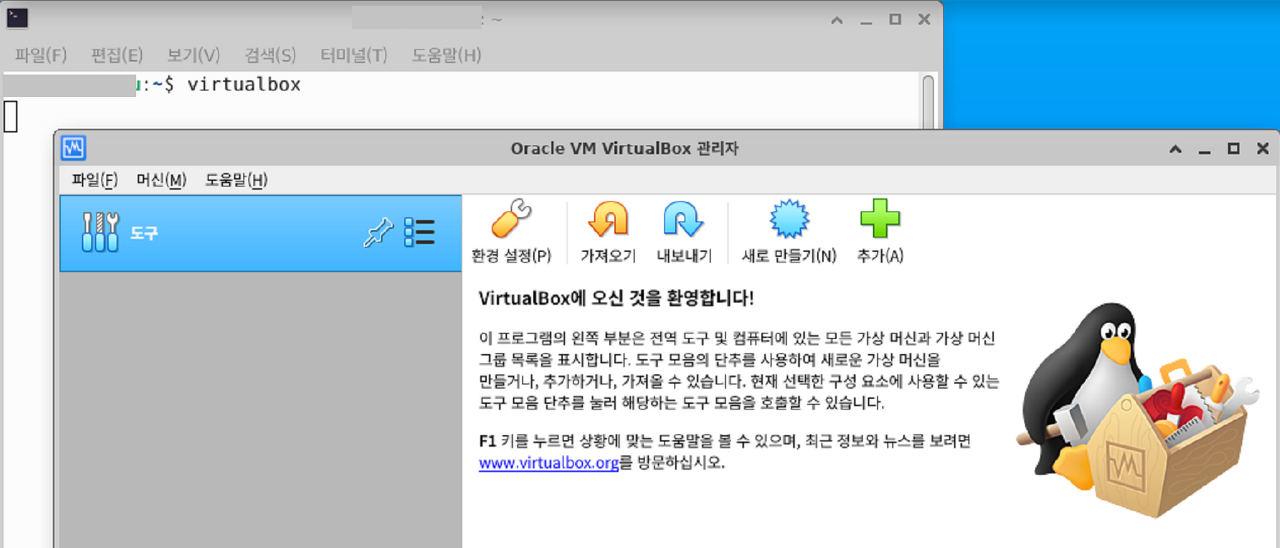 아래와 같이 VirtualBox가 정상 동작하는지 확인한다.