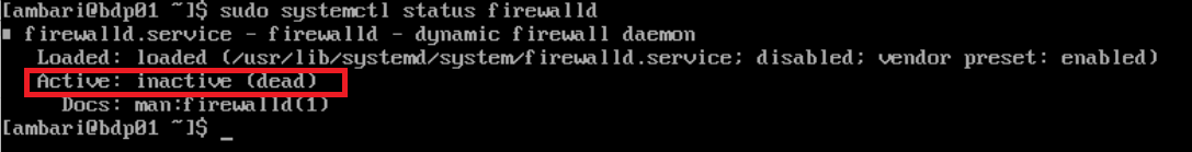 $ sudo systemctl status firewalld # inactive 인지 확인 (중단 성공 여부)