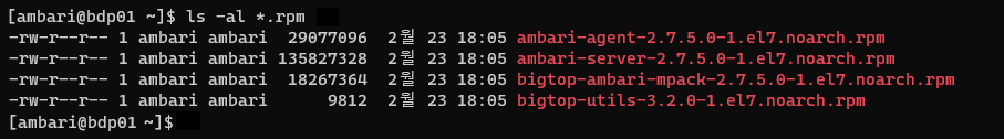 아래 명령을 사용하여 rpm 파일들을 ambari 계정의 홈 경로로 복사한다.