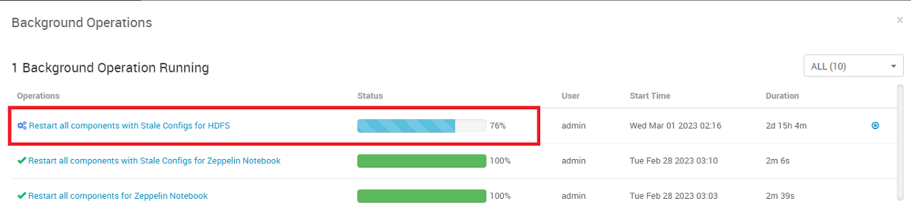 HDFS 서비스의 재시작에 대한 확인 메시지로 CONFIRM RESTART ALL 버튼을 클릭한다.