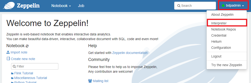 웹 브라우저에서 Zeppelin WebUI (9995 포트)로 접속하고 bdpadmin으로 로그인한다.