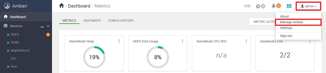 Ambari Dashboard 화면에서 우측 상단의 amin - Manage Ambari 버튼을 클릭한다.