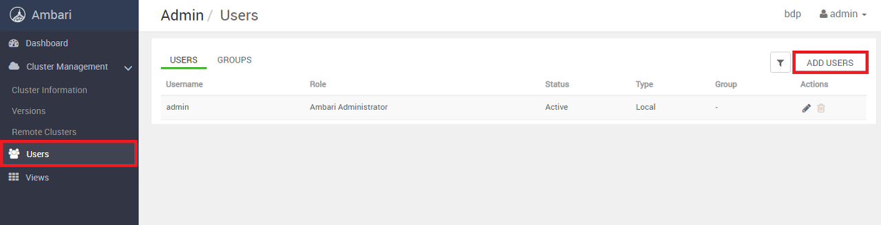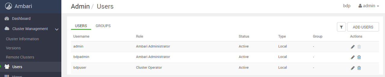 Ambari 관리 화면으로 전환되며, 좌측의 Users 를 클릭하고 ADD USERS를 선택한다.