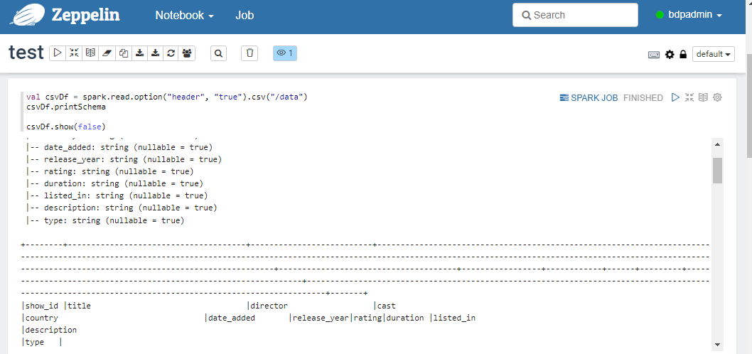 해당 데이터가 Zeppelin에서 잘 읽히는지 테스트를 진행한다.