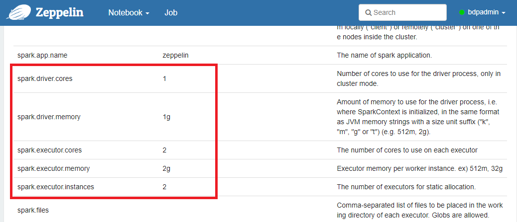 스크롤을 아래로 더 내리면 Spark 실행을 위한 리소스 설정 항목이 나온다.
