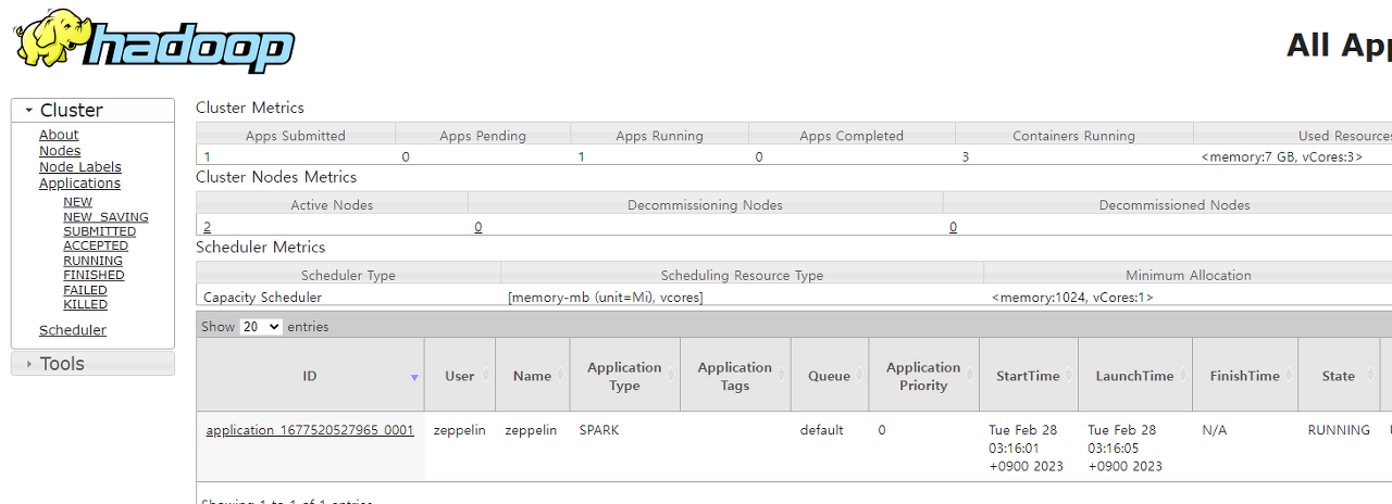 Hadoop YARN의 WebUI (8088)를 확인해보면 Zeppelin 계정에 의해 Spark이 실행 중인 것을 확인할 수 있다.